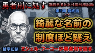 存在・自己・同一性 勇者刑に処す:綺麗な名前の制度ほど疑え。フーコーが語る哲学幻談 今回のテーマは、アニメ『勇者刑に処す 懲罰勇者9004隊刑務記録』の第1期最終回です。 この記事では、動画で語られた「勇者刑」という制度の哲学的な意味について触れつつ、動画内では時間の都合で語り尽くせなかった哲学者ミシェル・フーコーの波乱に満ちた生涯について、詳しく掘り下げていきます。 2026.04.02 存在・自己・同一性実存・不安・生きる意味社会・国家・権力